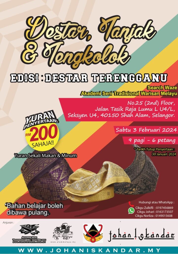 Bengkel tahap 1 dan ulangkaji serta tahap 2 bagi Destar Terengganu telah diadakan di Akademi Seni Tradisional Warisan Alam Melayu dengan 2 orang tenaga pengajar. Senarai jenis Destar yang diajar pada peserta tahap 1 adalah : Dato Bija Diraja; Belalai Gajah; Anak Belalai Gajah; Laksamana; dan Lang Melayang. Senarai jenis Destar yang diajar pada peserta tahap 2 adalah : Belah Mumbang; Temenggong; Bugis Tak Balik (Terengganu); Dagang Sakit Dirantau; Temalong Budu; dan Bendahara.